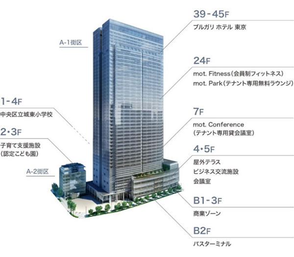 地上45階建ての低層階にはジャパンブランドにこだわったショップなど57店舗が集結。また4月には、高層フロアに国内初出店となる「ブルガリ ホテル 東京」が開業予定です。