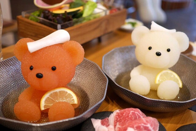 提供されているお鍋には、出汁を食物繊維とコラーゲンでぬいぐるみのような可愛らしい“くまちゃん”の形に固めた専用出汁を使用しているのが特徴で、水を入れた鍋に専用出汁を入れて火にかけると徐々に溶け出して、旨味をたっぷり含んだスープが出来上がる仕掛けです。