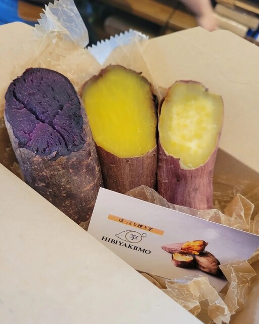 日比谷公園の新橋側の端にある「日比焼き芋」は3種類の焼き芋をテイクアウトできるお店で、滑らかな食感と濃厚で上品な甘みが楽しめるシルクスイートや、もっちりとした食感と紫色が特徴のふくむらさき、栗のようにホクホクとした甘みが特徴の鳴門金時の3種類のさつま芋をこだわりの焼き加減で提供しています。