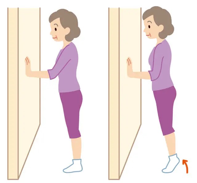 呼吸を止めないように意識して、力を入れているときは大きく息を吐くようにしましょう。バランス感覚に不安がある方や慣れていない方は、壁に手をつきながら行うと、ふらつきを抑えられます。