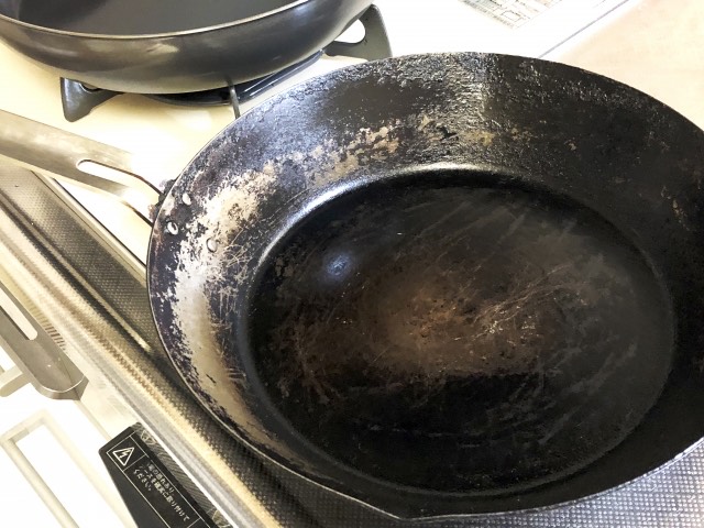鉄のフライパンは頑固な焦げが付きやすい素材です。焦げが気になったら、炭にしてから落としていきます。