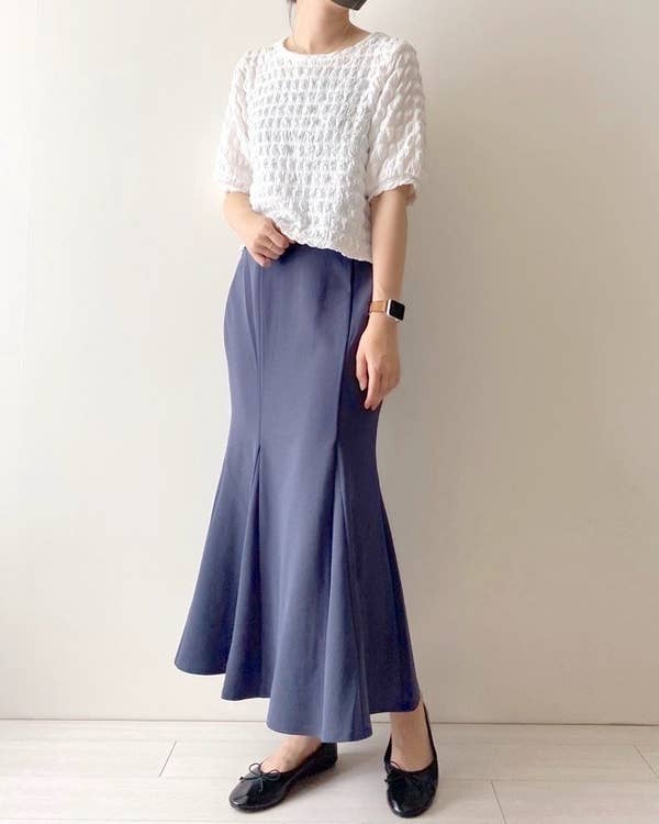 まるでマーメイドのような曲線的な美しさがシルエット特徴のこちらのスカートはとにかく大人気!エレガントな印象でお出かけやデートにピッタリですし、カジュアルにいきたい時にはTシャツや襟付きブラウスがおすすめ。足元はヒールやサンダルで女性らしさを出すことでこの夏さらに一味違う着こなしで街に出れちゃいます。